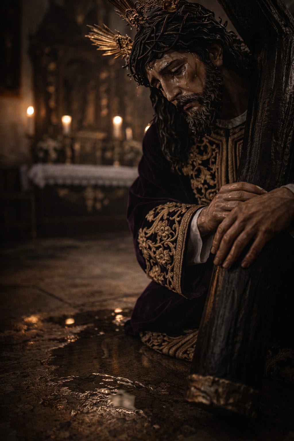 El hermano se acercó y comprobó, al igual que el párroco, que no había goteras ni humedades en el techo de la capilla. Ambos se miraron sin comprender qué había sucedido allí y, a pesar de que no se lo contaran a nadie, sabían que estaban ante un suceso extraordinario. Limpiaron con suavidad las pequeñas gotas que resbalaban hasta la barba de Jesús Nazareno y vieron el reguero acuoso salir desde el lagrimal. Tanto el cura como su acompañante pensaron en ese momento en la noche anterior, en ese homenaje de la Agrupación musical hacia un hombre que siempre había estado junto al Nazareno, aunque ninguno supo reconocer la magnitud de lo que veían.